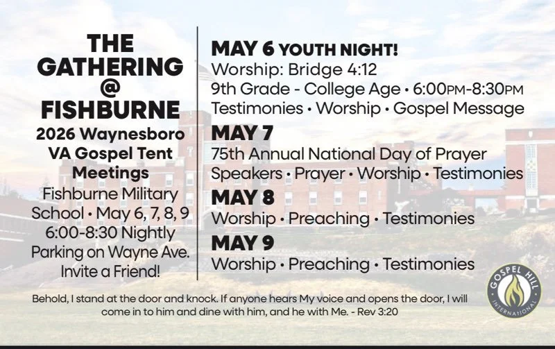 Your precious prayers and support of the ongoing work of the Lord through Gospel Hill Ministries will help take the Gospel of Jesus Christ to the Shenandoah Valley, The Piedmont, and the World.